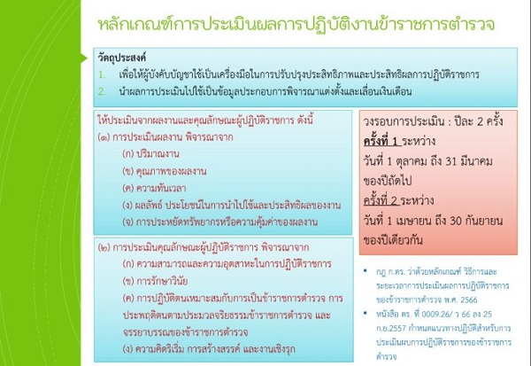 - กำชับการปฏิบัติเกี่ยวกับการประเมินผลการปฏิบัติราชการของข้าราชการตำรวจ